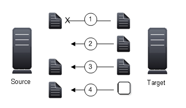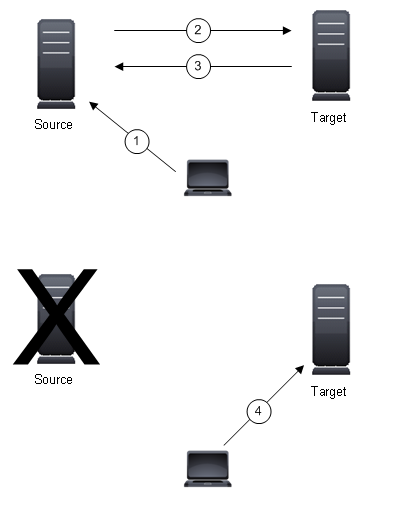 - In the event the source fails, the target stands in for the source. User and application requests are still sent to the source name or IP address, which are now running on the target.