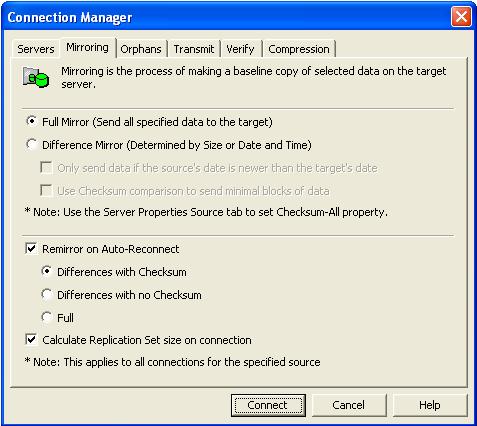 If desired, you can configure mirror settings before establishing your connection. Select the Mirroring tab on the Connection Manager.