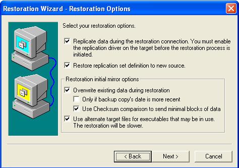 Only if backup copy's date is more recent—This option restores only those files that are newer on the target than on the new source. The entire file is overwritten with this option.