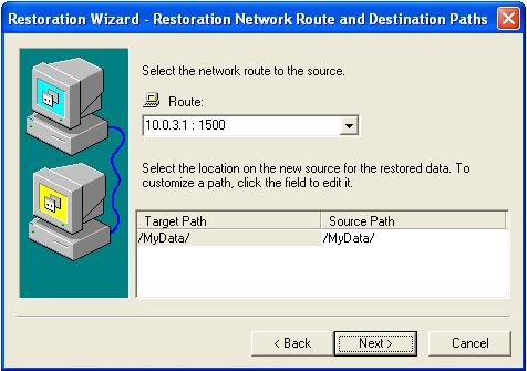 Select your network route to the new source, which includes the IP address and port number. Also select the location on the new source for the restored data. If you want to set a customized path, click in the field under Source Path to edit the location.