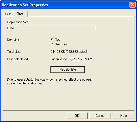 If your replication set contains a large number of files, for example, ten thousand or more, you may want to disable the calculation of the replication set size so that data will start being mirrored sooner. If calculation is enabled, the source calculates the file size before it starts mirroring. This can take a significant amount of time depending on the number of files and system performance. Disabling calculation will result in the mirror status not showing the percentage complete or the number of bytes remaining to be mirrored.
