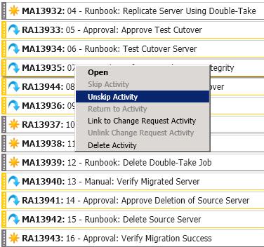Removing, adding, and changing the order of activities in the Double-Take Move templates is not supported and may cause automation Runbooks to fail. The activities are sequential and the Runbooks rely on the sequence of each activity in order to orchestrate the workflow and report status of each activity.