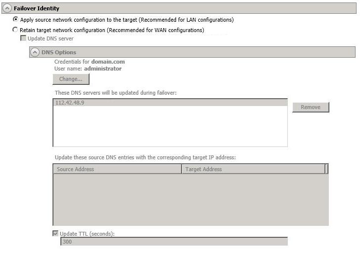 If you select Retain your target network configuration but do not enable Update DNS server, you will need to specify failover scripts that update your DNS server during failover, or you can update the DNS server manually after failover. This would also apply to non--Microsoft Active Directory Integrated DNS servers. You will want to keep your target network configuration but do not update DNS. In this case, you will need to specify failover scripts that update your DNS server during failover, or you can update the DNS server manually after failover.