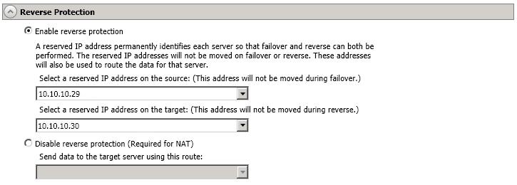 Enable reverse protection—After failover, your target server is lost. Reverse protection allows you to store a copy of the target's system state on the source server, so that the target server will not be lost. The reverse process will bring the target identity back on the source hardware and establish protection. After the reverse, the source (running on the original target hardware) will be protected to the target (running on the original source hardware).