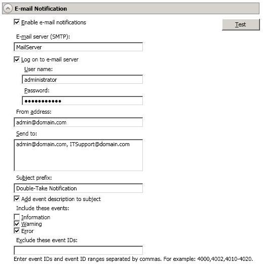 You can email Double-Take event messages to specific addresses, using an SMTP mail server.