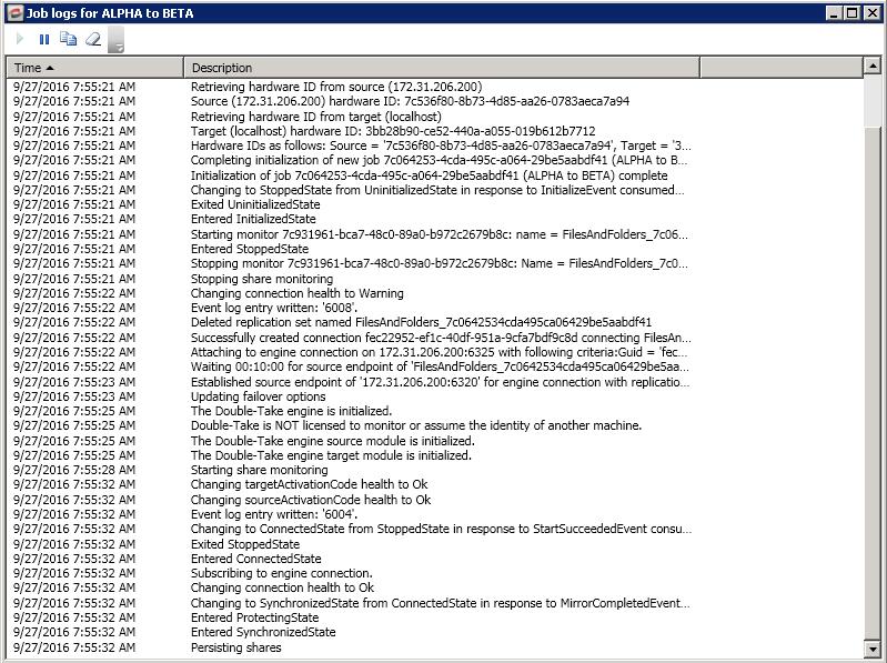 You can view a job log file through the Double-Take Console by selecting View Job Log from the toolbar on the Jobs page. Separate logging windows allow you to continue working in the Double-Take Console while monitoring log messages. You can open multiple logging windows for multiple jobs. When the Double-Take Console is closed, all logging windows will automatically close.