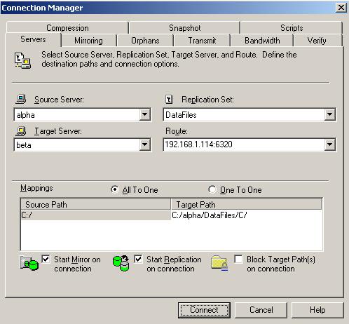 After you have created a replication set, you can establish a connection through the Connection Manager by connecting the replication set to a target.