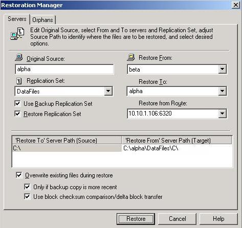 The Restore To Server path and Restore From Server path paths will automatically be populated when the replication set is selected. The restore to path is the directory that is the common parent directory for all of the directories in the replication set. If the replication set crosses volumes, then there will be a separate path for each volume. The restore from path is the path on the target server where the replicated files are located.