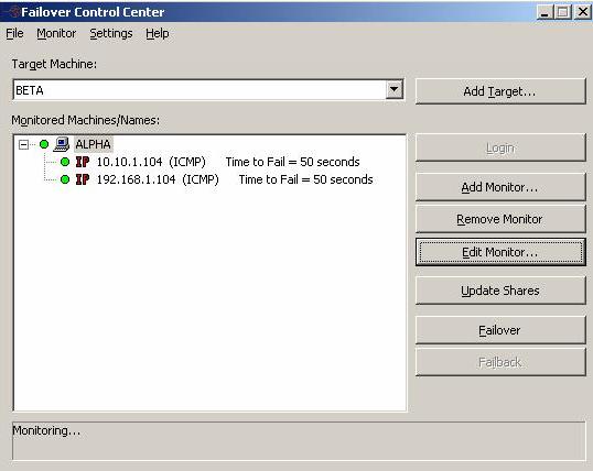 From the Failover Control Center, you can manage, monitor, and control failover for your Double-Take Availability servers. The Failover Control Center displays a main window for monitoring failover activity. Control buttons to the right allow you to configure and manage your servers.