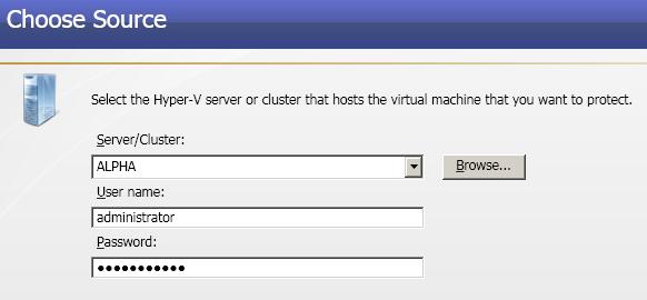 Server/Cluster—Specify the name or IP address of the Hyper-V server or cluster that is hosting the virtual machine that you want to protect. You can click Browse to select a server from a network drill-down list.
