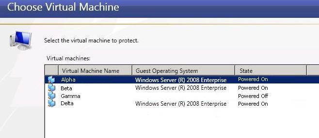 Choose the virtual machine on the Hyper-V source that you want to protect. The list of virtual machines will vary depending on whether your source is a Hyper-V server, cluster, or node. Select a virtual machine from the list and click Next to continue.