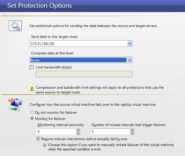 If you update one of the advanced settings (IP address, gateway, or DNS server), then you must update all of them. Otherwise, the remaining items will be left blank. If you do not specify any of the advanced settings, the replica virtual machine will be assigned the same network configuration as the source.