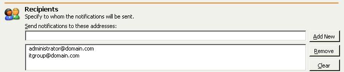 Recipients—Specify the e-mail address that each Double-Take Move e-mail message should be sent to and click Add New. The e-mail address will be inserted into the list of addresses. Each address is limited to 256 characters, and you can add up to 256 e-mail addresses. If you want to remove an address from the list, highlight the address and click Remove. If you want to remove all of the addresses from the list, click Clear.