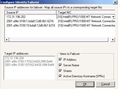 Under Source IP address to failover, map a Source IP address to a Target NIC. The target NIC will assume the source IP address during failover. The Target IP addresses list displays the IP address(es) of the selected Target NIC.