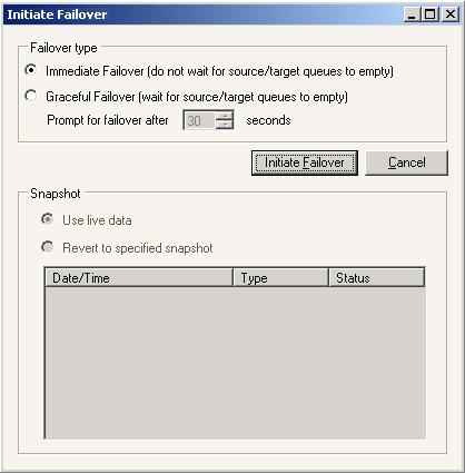 Specify if you want to perform an immediate or graceful failover. An immediate failover begins immediately without waiting for the data queues on the source and target to empty. A graceful failover waits until the queues are emptied before continuing. If you select the graceful failover, specify how often you want the failover prompt to continue asking for failover while there is still data in the queues.