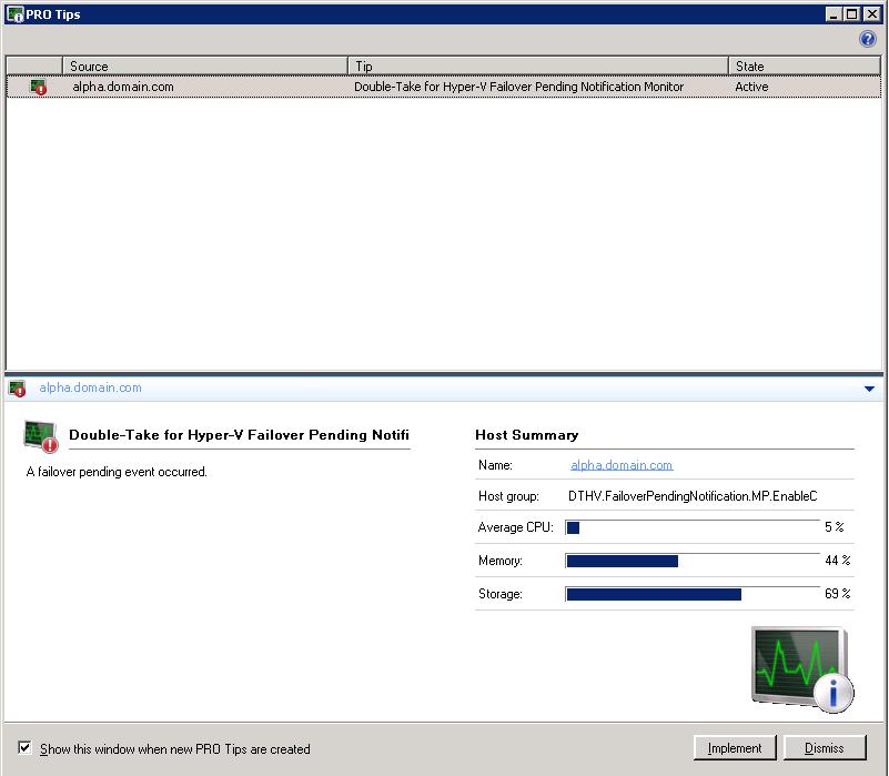 Microsoft System Center Virtual Machine Manager (SCVMM) provides centralized administration for your Hyper-V virtual machines. Within SCVMM, Performance and Resource Optimization (PRO) provides a basic set of monitors that can alert you to situations where you may want or need to modify a virtual machine configuration in order to optimize the host or virtual machine. These alerts, called PRO tips, recommend actions for you to take to return a host, virtual machine, or any other component of a virtual environment to a healthy state. Double-Take Availability extends the PRO capabilities by providing specific PRO tips for Hyper-V virtual server failover.