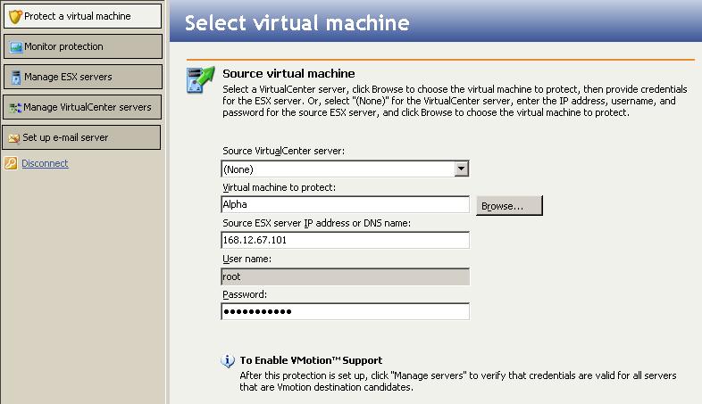 The Double-Take Availability for VMware Infrastructure console allows you to establish protection of host-level virtual disk files (the .vmdk files) from an ESX source to an ESX target. You can also initiate failover and failback.
