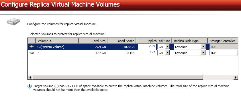 Replica Disk Size—For each volume you are protecting, specify the size of the replica virtual machine on the target. Be sure and include the value in MB or GB for the disk. The value must be at least the size of the specified Used Space on that volume.