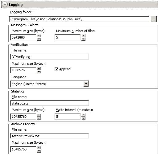 - Logging folder—Specify the directory where each of the log files in this section are stored. The default location is the directory where the Double-Take Availability program files are installed.