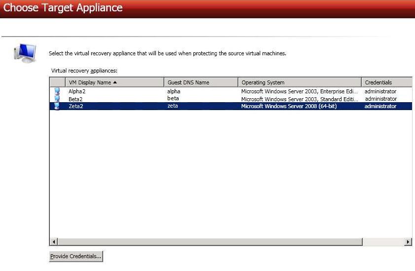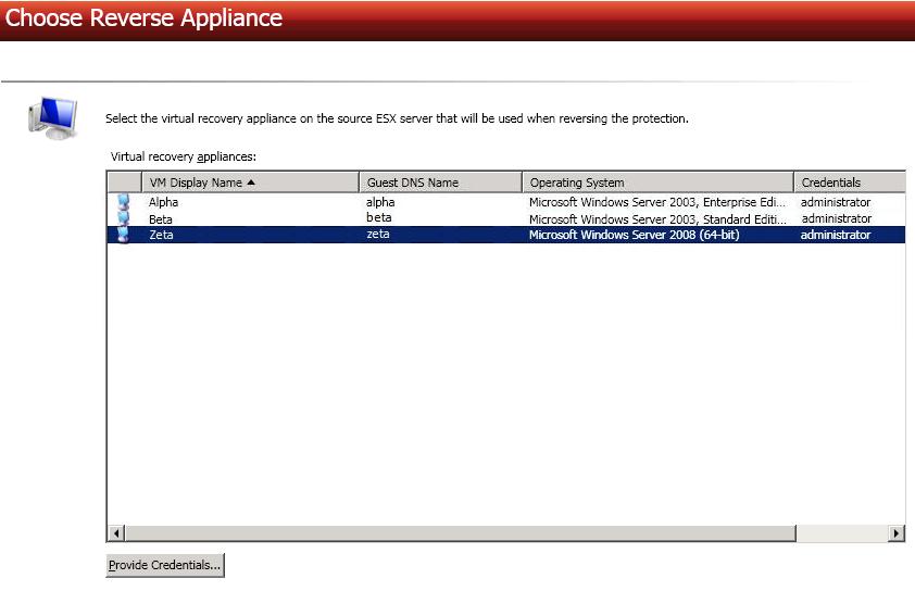 Select your virtual recovery appliance on your target ESX server. Only valid virtual recovery appliances will be displayed in the list. If necessary, click Provide Credentials and specify a valid user on the virtual recovery appliance you have selected. The user must be a member of the Double-Take Admin security group.