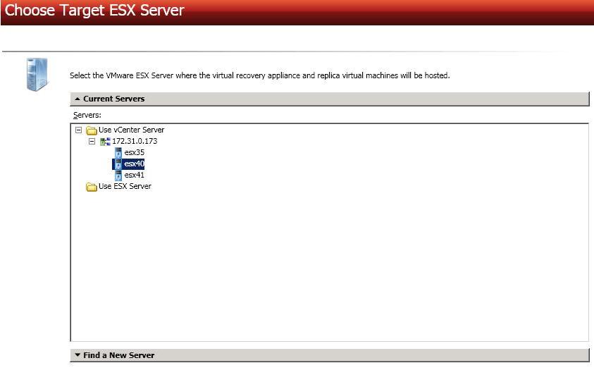 Choose your target server. This is the ESX host where your replica source virtual servers will be created.