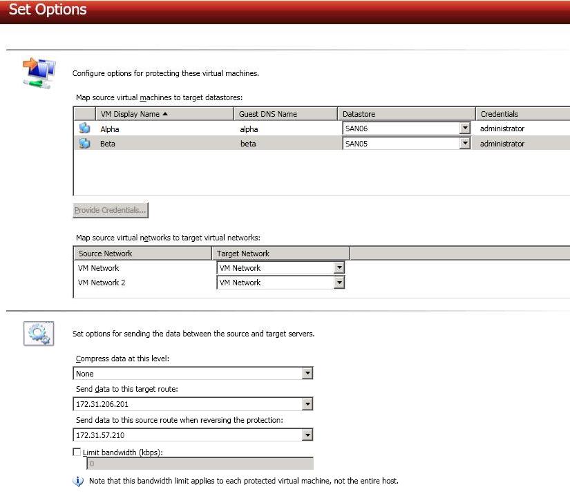 - Map source virtual machines to target datastores—For each virtual server you are protecting, select a datastore on the target ESX host where the replica source virtual server will be created. If necessary, click Provide Credentials and specify a valid user on each virtual server.