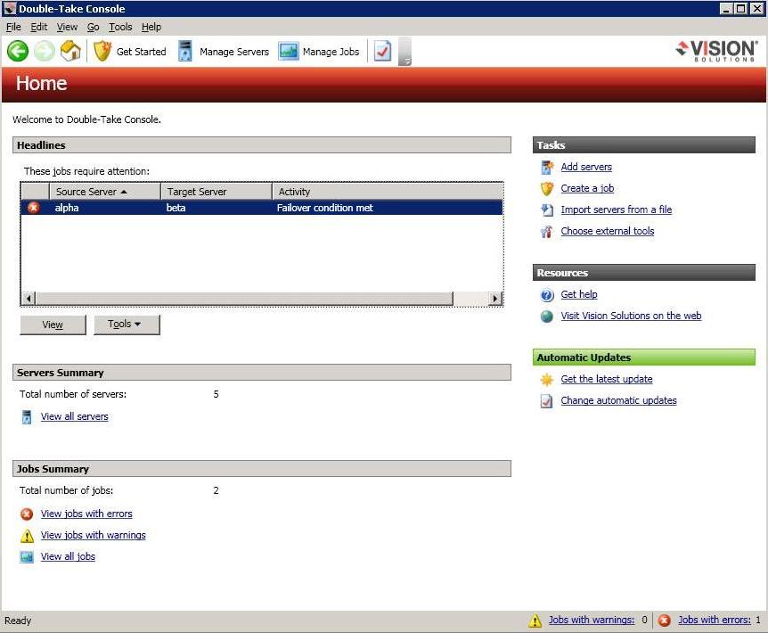 The Double-Take Console is used to protect and monitor your servers and jobs. Each time you open the Double-Take Console, you start at the Home page. This page provides a high-level overview of the status of your jobs.