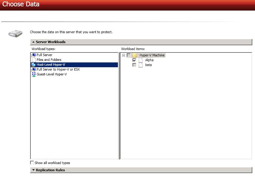 Choose the type of workload that you want to protect. Under Server Workloads, in the Workload types pane, select Host-Level Hyper-V. In the Workload items pane, select the virtual machine on the Hyper-V source that you want to protect. The list of virtual machines will vary depending on whether your source is a Hyper-V server, cluster, or node.