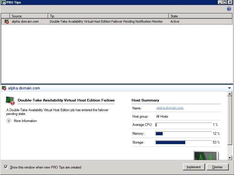 Microsoft System Center Virtual Machine Manager (SCVMM) provides centralized administration for your Hyper-V virtual machines. Within SCVMM, Performance and Resource Optimization (PRO) provides a basic set of monitors that can alert you to situations where you may want or need to modify a virtual machine configuration in order to optimize the host or virtual machine. These alerts, called PRO tips, recommend actions for you to take to return a host, virtual machine, or any other component of a virtual environment to a healthy state. Double-Take extends the PRO capabilities by providing specific PRO tips for host-level Hyper-V jobs.