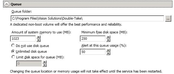 Queue folder—This is the location where the disk queue will be stored. Any changes made to the queue location will not take effect until the Double-Take service has been restarted on the server.